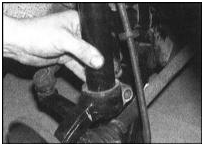 5. При помощи монтировки осторожно опустите нижний рычаг, высвобождая шаровую опору из своего посадочного хомута в основании ступичной сборки, - постарайтесь не допустить чрезмерного натяжения тормозного шланга. Если сборка не отделяется от стойки, большой отверткой с плоским жалом аккуратно разведите губки крепежного хомута. На моделях, оборудованных стабилизатором поперечной устойчивости, постарайтесь не допустить выпадения резиновой подушки и шайбы верхней опоры стойки штанги стабилизатора.