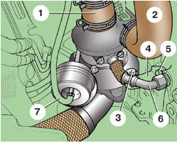 1 – шланг заднего воздуховода; 2 – шланг нижнего воздуховода; 3 – болт крепления турбокомпрессора; 4 – кронштейн турбокомпрессора; 5 – болт крепления кронштейна; 6 – шланг слива масла из турбокомпрессора; 7 – вакуумный шланг регулятора давления наддува