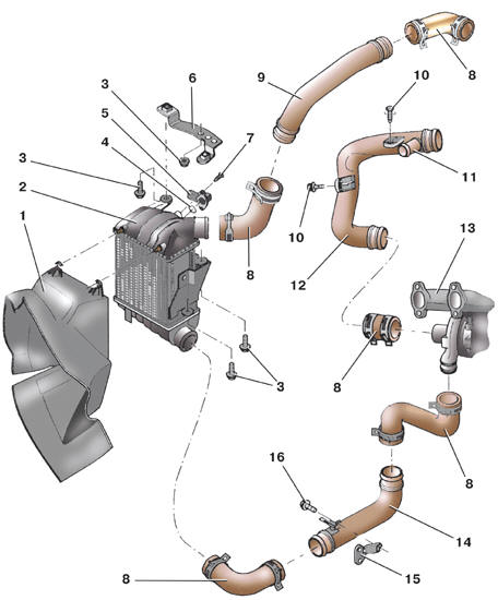 Снятие и установка промежуточного охладителя воздухаLancia Musa / Система питания / Снятие и установка промежуточного охладителя воздуха