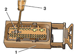 5. С помощью отвертки 3 (см. рис. Отсоединение жгута проводов от колодки блока